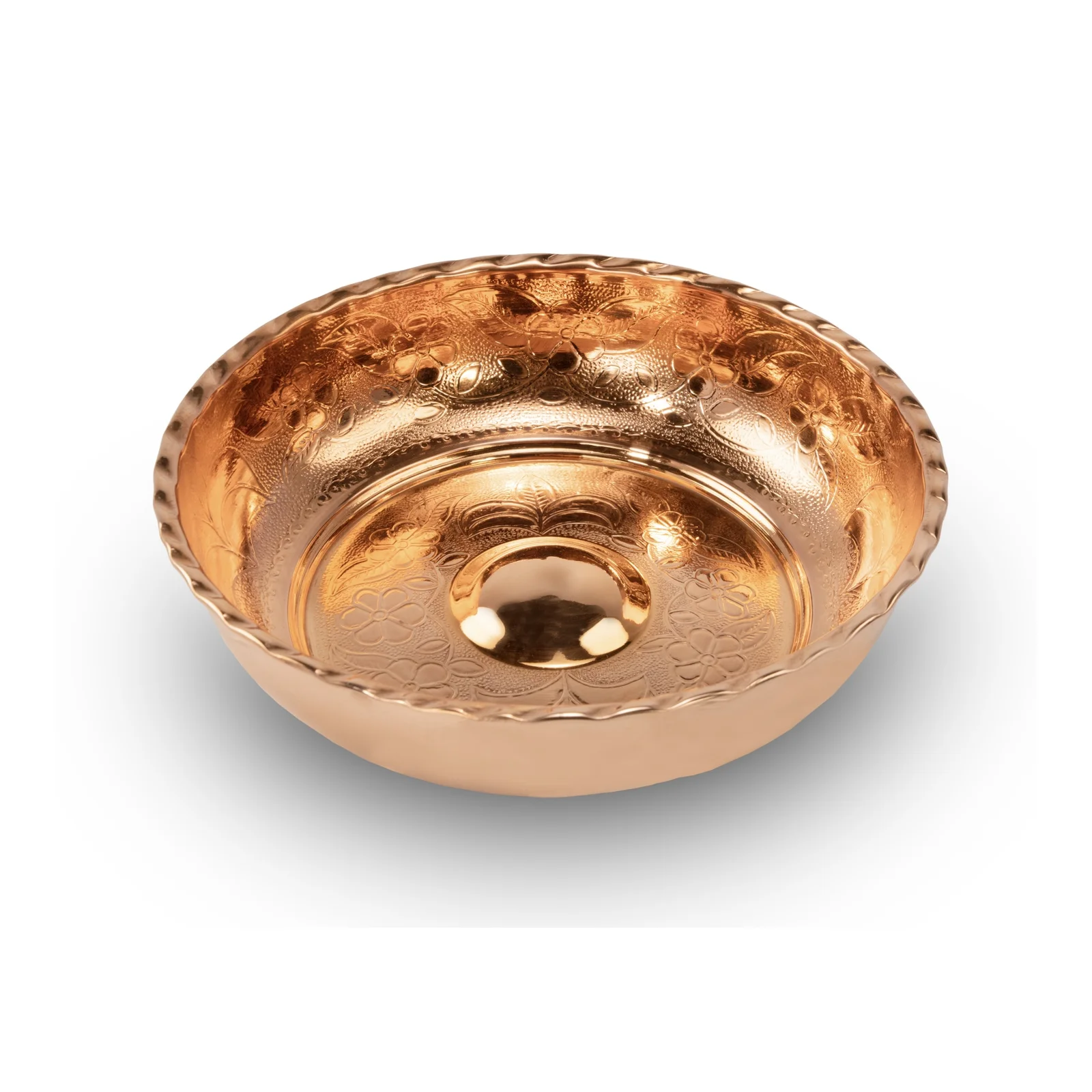 Bol hammam cuivre léger avec motif oriental et détail central décoratif. Cuivre naturel chaud, Ø20×5 cm, 175 g. Grand bol de bain turc pour hôtels-spas, hammams et retail. MOQ 10 pcs.