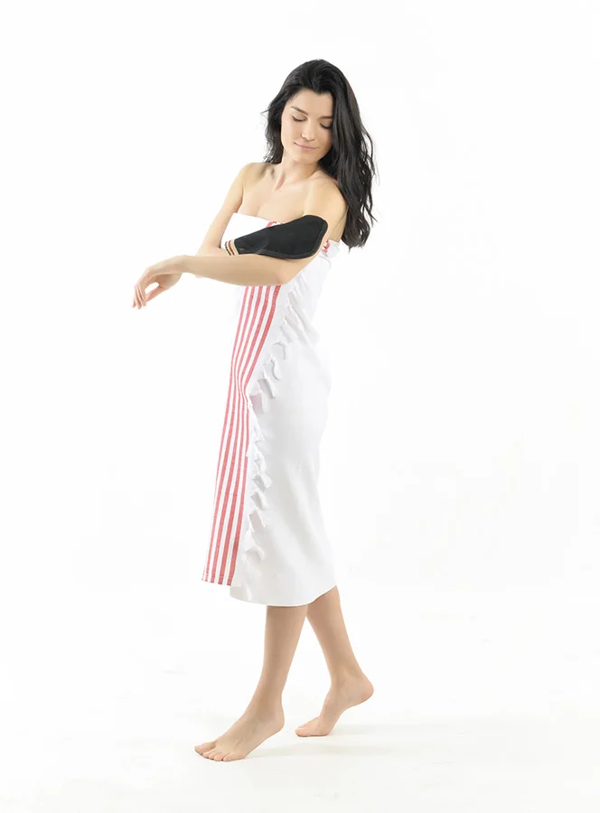 Минималистичный белый турецкий пештемаль с пятью тонкими красными полосами на одном крае. 100% хлопок, 400 г, быстросохнущий. Для отелей и спа. МЗК 20 шт.