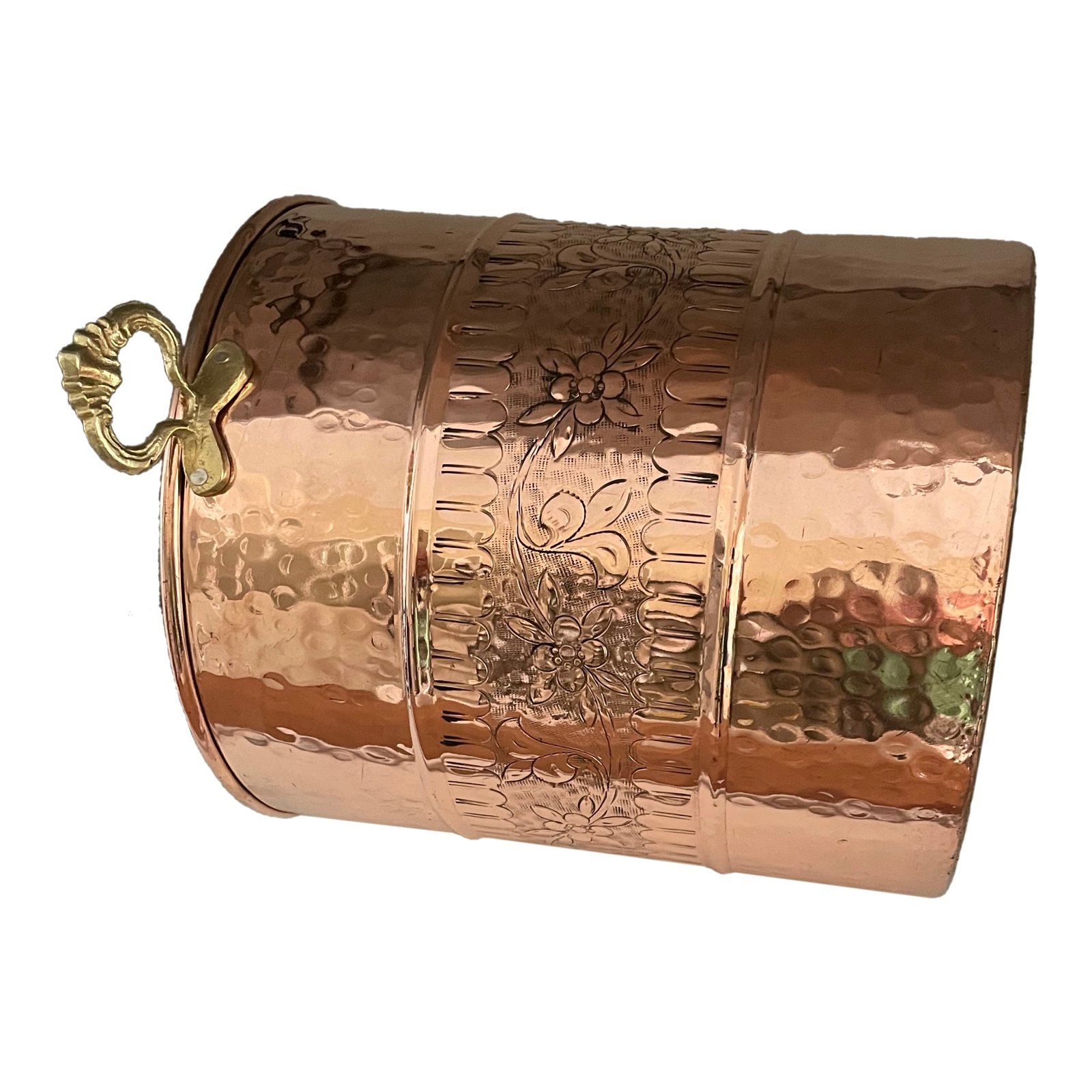 Geleneksel Türk hamamı ritüelleri için el yapımı kalay kaplı bakır köpük kovası KK-002. 31×34 cm, sağlam dövme bakır gövde, pürüzsüz kalay kaplı iç yüzey. Oteller, hamamlar ve kaplıcalar için toptan satış. MOQ 2 adet.